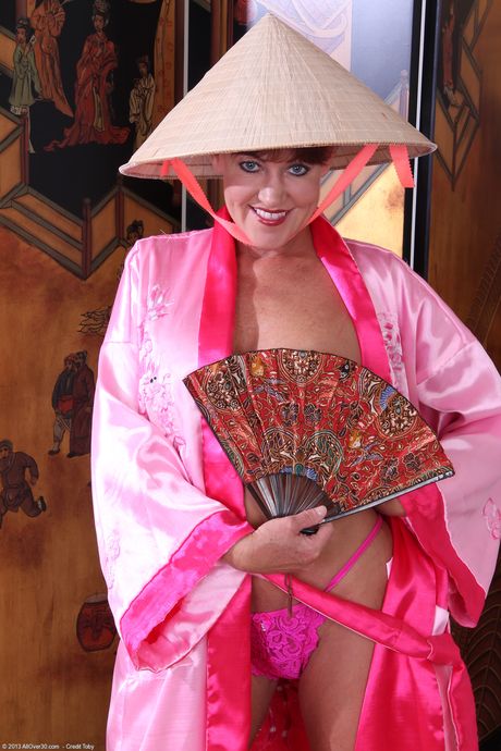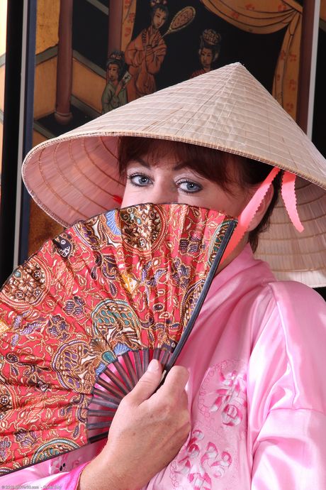 Mature woman Shauna strips to black pumps afore an Oriental screen
