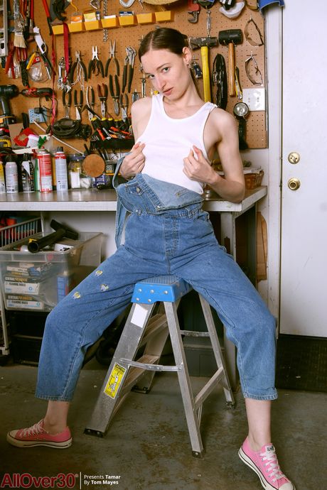 Over 30 woman Tamar goes naked in her workshop in canvas sneakers