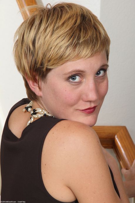Petite MILF Katrina Mathews spreads her hairy pussy in a hot striptease