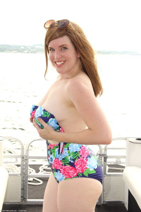 Redheaded mature Holly Fuller shows her big tits and ass on a boat