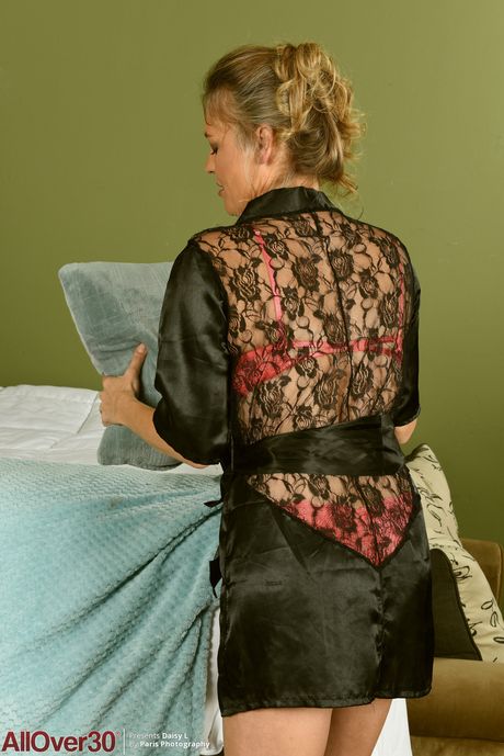 Skinny mature Daisy Layne shows her big ass & spreads her hairy pussy