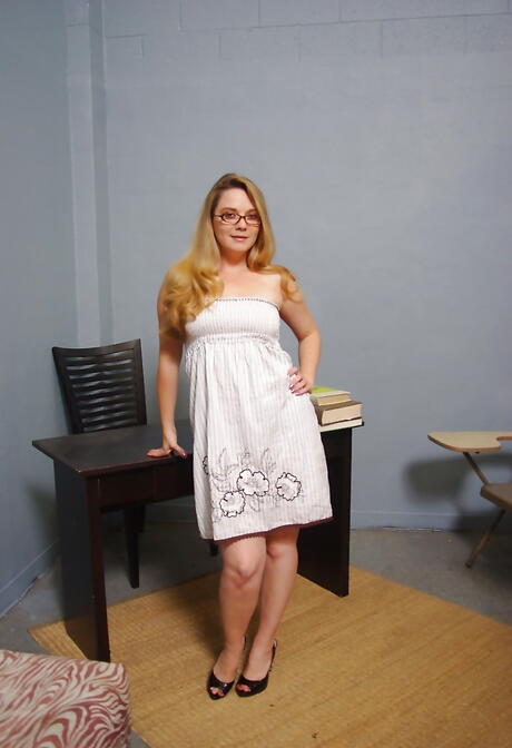 Alluring blonde fat Tera Knightly in sexy skirt showing big hooters and hot butt