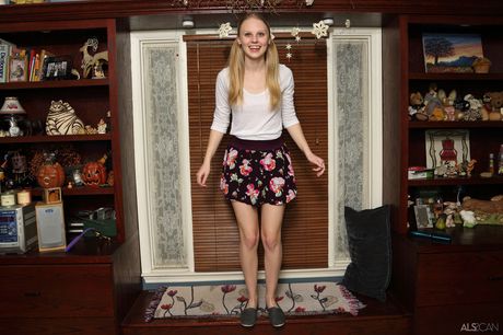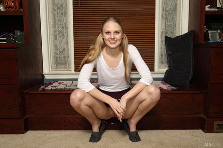 Blonde amateur Lily Rader plays with her pink pussy after getting naked