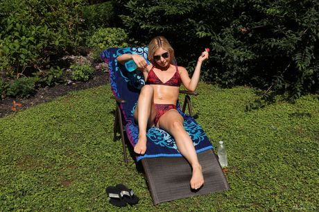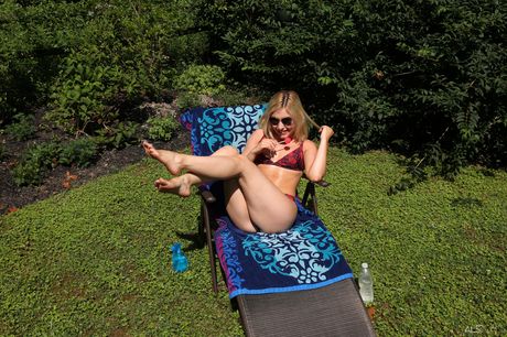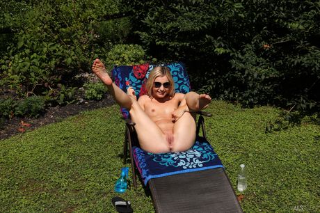 Blonde teen Minxx Marii gets naked before pissing on a backyard patio