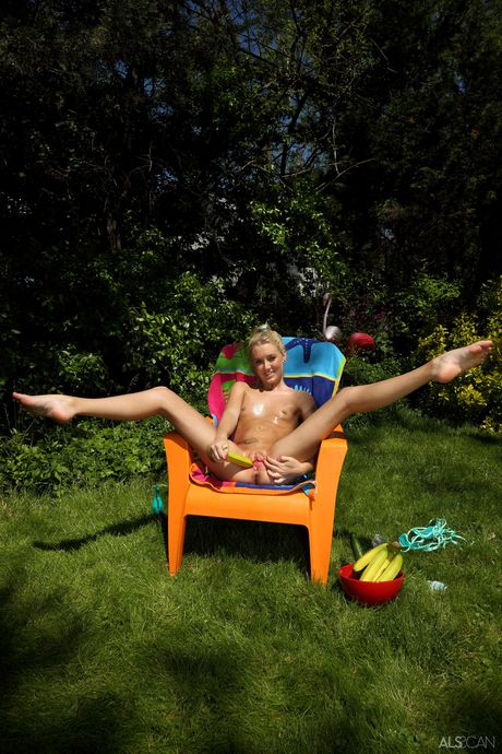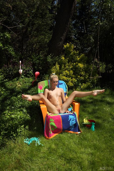 Blonde teen Roxxi Silver masturbates with a cucumber on a patio chair