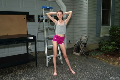 Delicate teen Aria Haze takes it all off on a workbench out in a driveway
