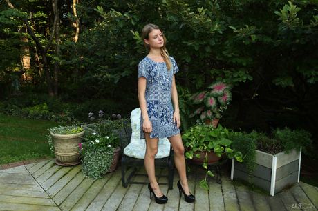 Delicate teen Asuna toys her pussy before pissing on a deck