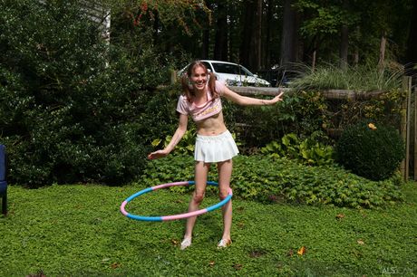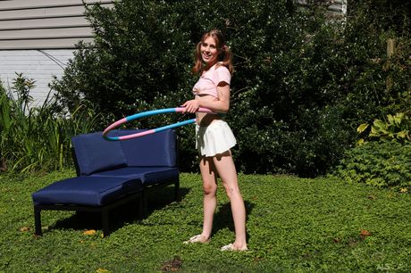 Delicate teen Fiona Sprouts toys her pussy with a glass dildo in the backyard