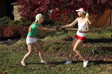 German teen Franziska Facella & Sara Jaymes have lesbian sex in a bathroom