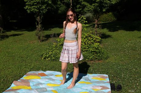 Nadia Noja strips her pink dress and panties and exposes her slim figure