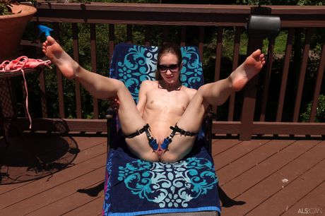 Naked teen Nadia Noja removes her bikini to pose nude in a backyard