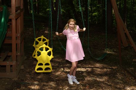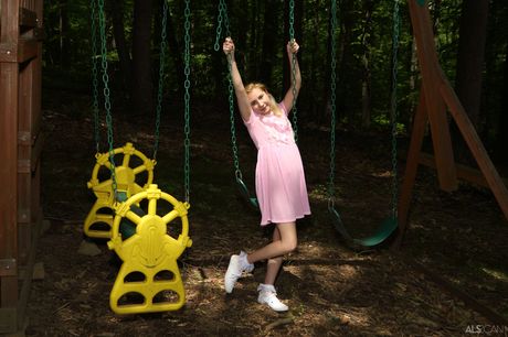 Petite blonde teen Odette Delacroix pegs her pussy open on a slide
