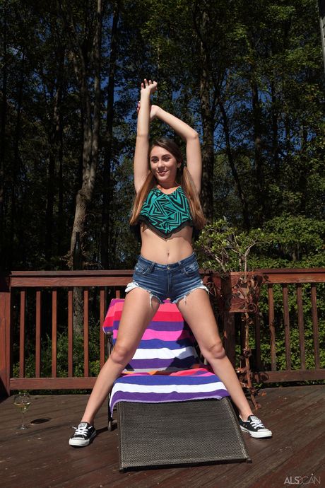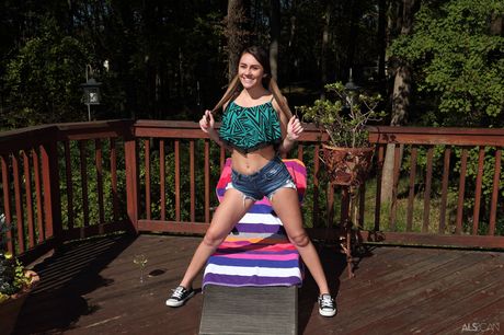 Petite teen Mackenzie Mace attaches clamps to her pussy in the backyard