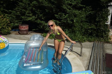 Sexy blonde Cayenne strips off her bikini and teases with her shaved pussy