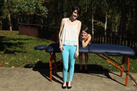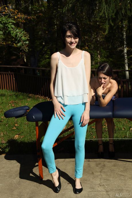 Slender teen Freya Von Doom & her girlfriend fist each other on the patio