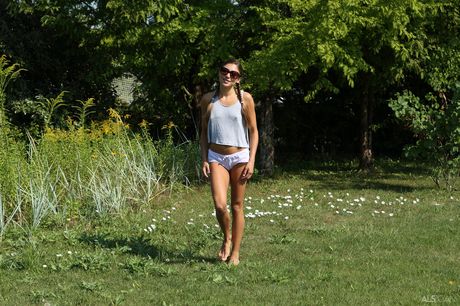 Slender teen Talia Mint pissing and masturbating her pussy outdoor
