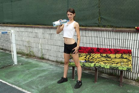 Slender teen Tera Link masturbates with a banana after playing tennis