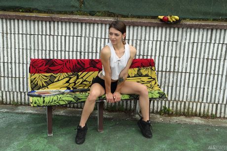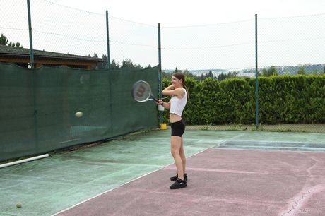 Slender teen Tera Link strips & toys her shaved pussy with a banana