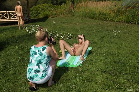 Svelte teen Anya Krey gets naked and oiled up in the backyard