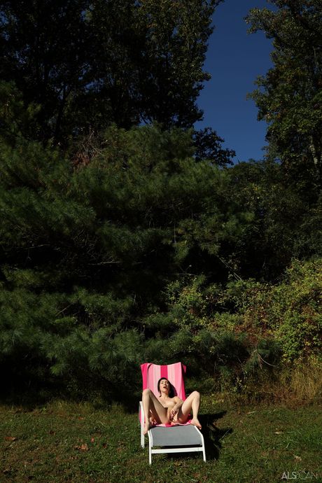 Svelte teen Aria Alexander strips and toys her pussy on a patio