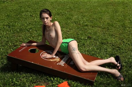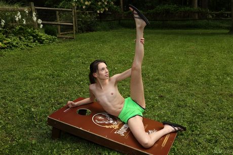 Svelte teen Aria Haze fists her pussy after playing a game of bean bag toss