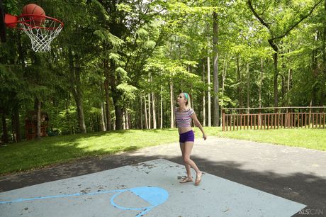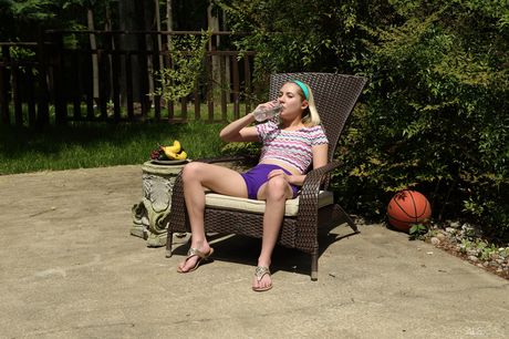 Thin teen Odette Delacroix toys her pussy with a cucumber on a patio