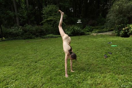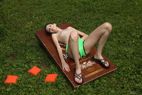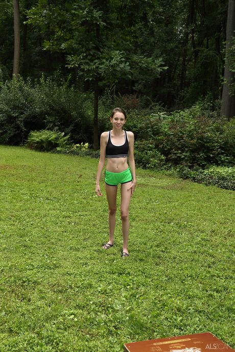 Thin teenage brunette with tiny tits stripping and toying her cunt