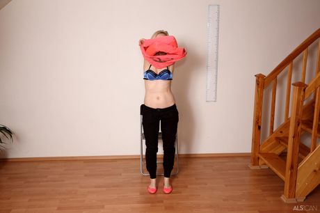 Thin teenage hottie Layla A strips at the casting and exposes her tiny tits