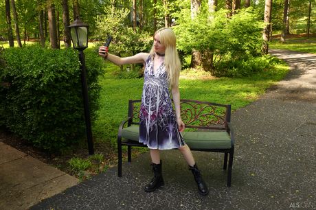Young blonde Celestina Blooms gets naked in a backyard before a bottle insertion