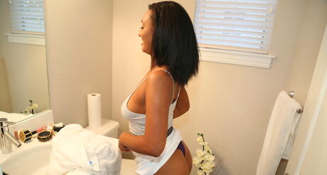 Amazing ebony dark hair cutie Adrianna Knight in sexy skirt exposes her butt