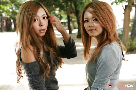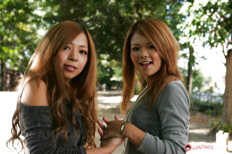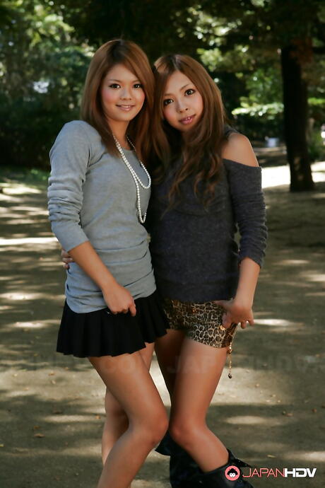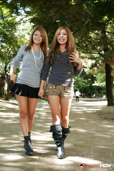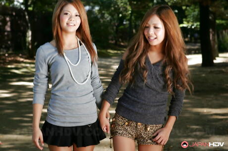 Amazing girls Tsubasa and Kanon in shorts enjoy some playful lesbian foreplay outside