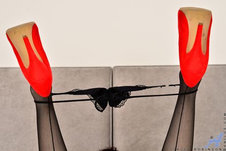 Amateur MILF Stacey Robinson toys her shaved pussy in stockings