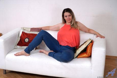 Blonde housewife Anastasiya shows her big tits and shaved pussy in a solo