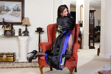 Blonde housewife Genivieve toys her shaved pussy in a sexy striptease