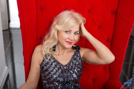 Blonde mature in stockings Sylvie shows her shaved pussy up close