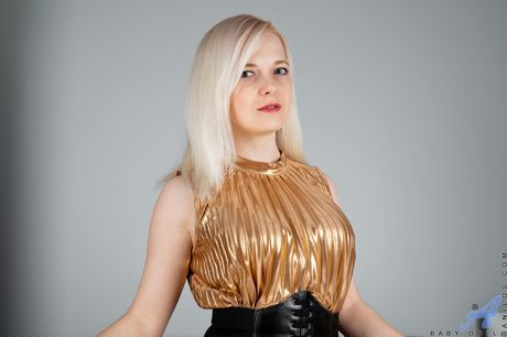 Blonde MILF in stockings Baby Doll shows her shaved pussy up close