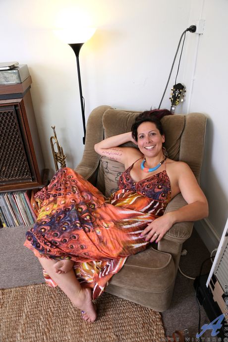 Brunette housewife Jade Winters removes a black dress to pose naked