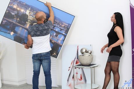 Brunette MILF Eva Ann seduces her man in a black dress and stockings