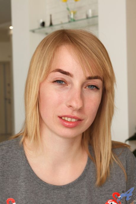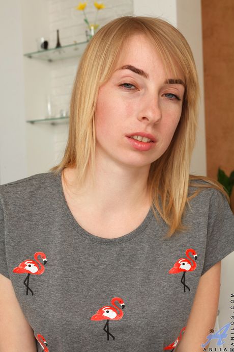 Mature blonde Anita shows her shaved pussy and small tits in a solo