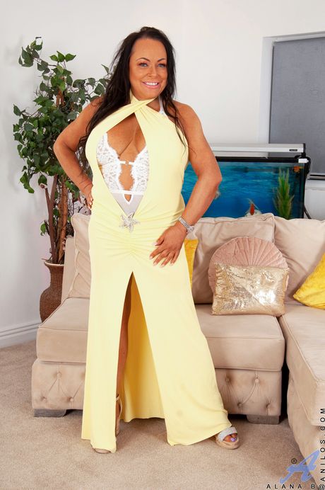 Mature brunette Alana B toys her shaved pussy with a big dildo
