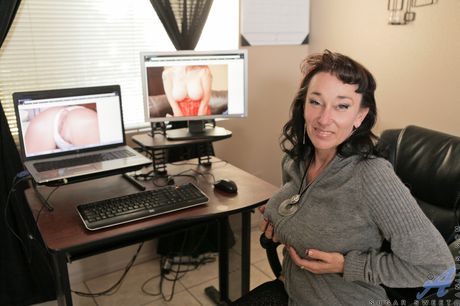 Mature brunette Sugar Sweet shows her big tits and masturbates in boots