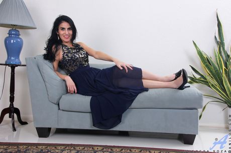 Mature woman Theresa Soza gets nude in high heels on a bed