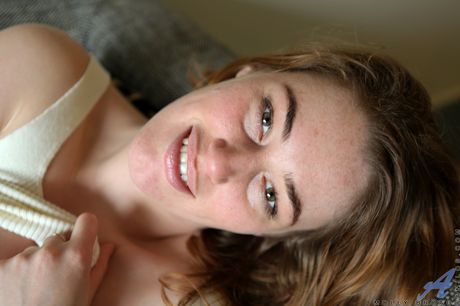 Redheaded housewife Molly Broad takes it all off on a bed before masturbating