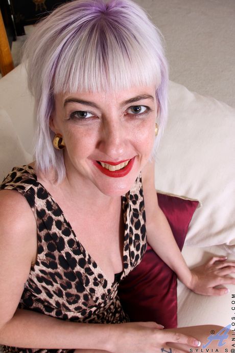 Sexy blonde MILF Sylvia S shows her big tits and shaved pussy on a couch