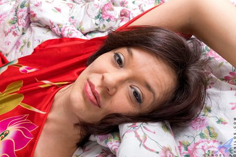 Sexy brunette Angel A shows her hairy pussy and toes in a solo