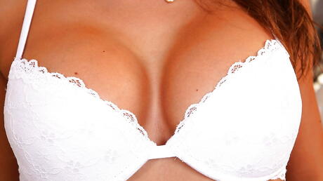 Appealing czech brunette milf Satin Bloom exhibiting big tits and hot ass in the bathroom