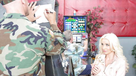 Attractive american blonde porn star Stevie Shae posing in shorts on camera