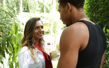Attractive american brunette Jaye Summers in sexy shorts drilled by big black cock after good cock suck outside