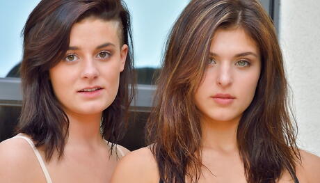 Attractive girls Leah Gotti and Brooklyn Jane in sexy jeans enjoy a passionate lesbian foreplay near the pool