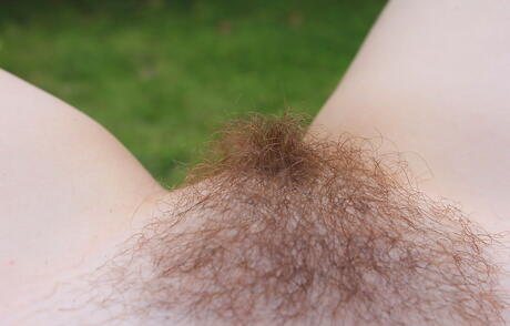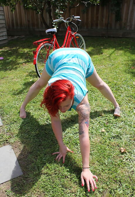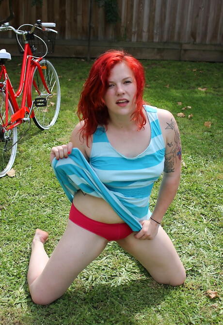 Attractive red-haired Jette baring tiny tits and hairy pussy outdoor